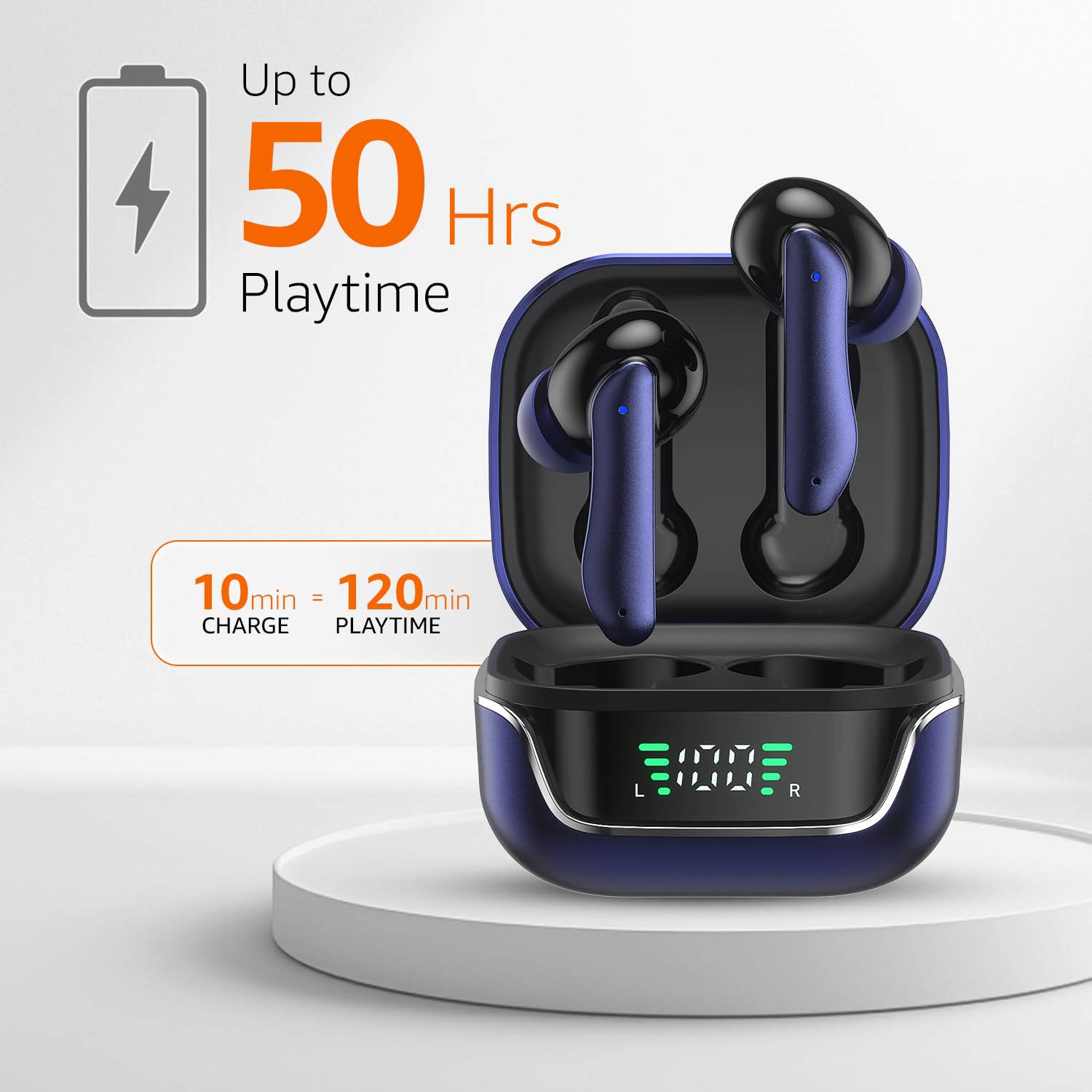 amazon basics TWS in-Ear Earbuds (AB-T01A) with Fast Charging up to 50 Hours of Playtime | Dual 10mm Driver | IPX4 Water-Resistance | Bluetooth 5.3 | Charging Case with Mic | Touch Control (Blue)