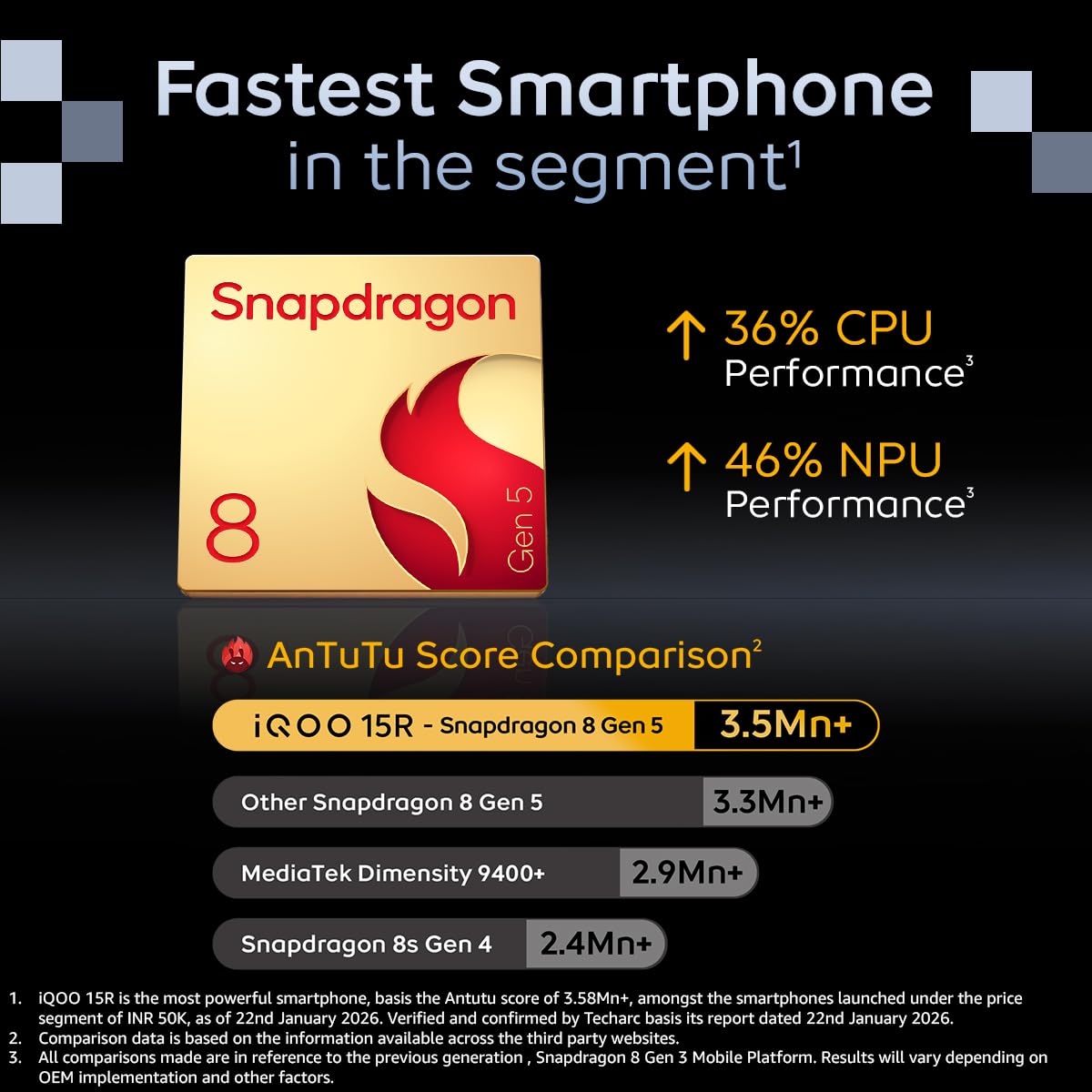 - Fastest Smartphone in the Segment - Powered by the flagship Snapdragon 8 Gen 5, delivering remarkable 36% CPU and 46% NPU performance gains. Built on advanced TSMC 3nm process technology, it achieves an exceptional 3.5Mn+ AnTuTu score. Paired with LPDDR5X Ultra RAM and UFS 4.1 storage, experience effortless speed, refined power, and uncompromising flagship-level performance.