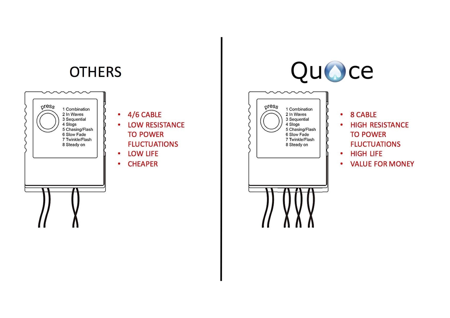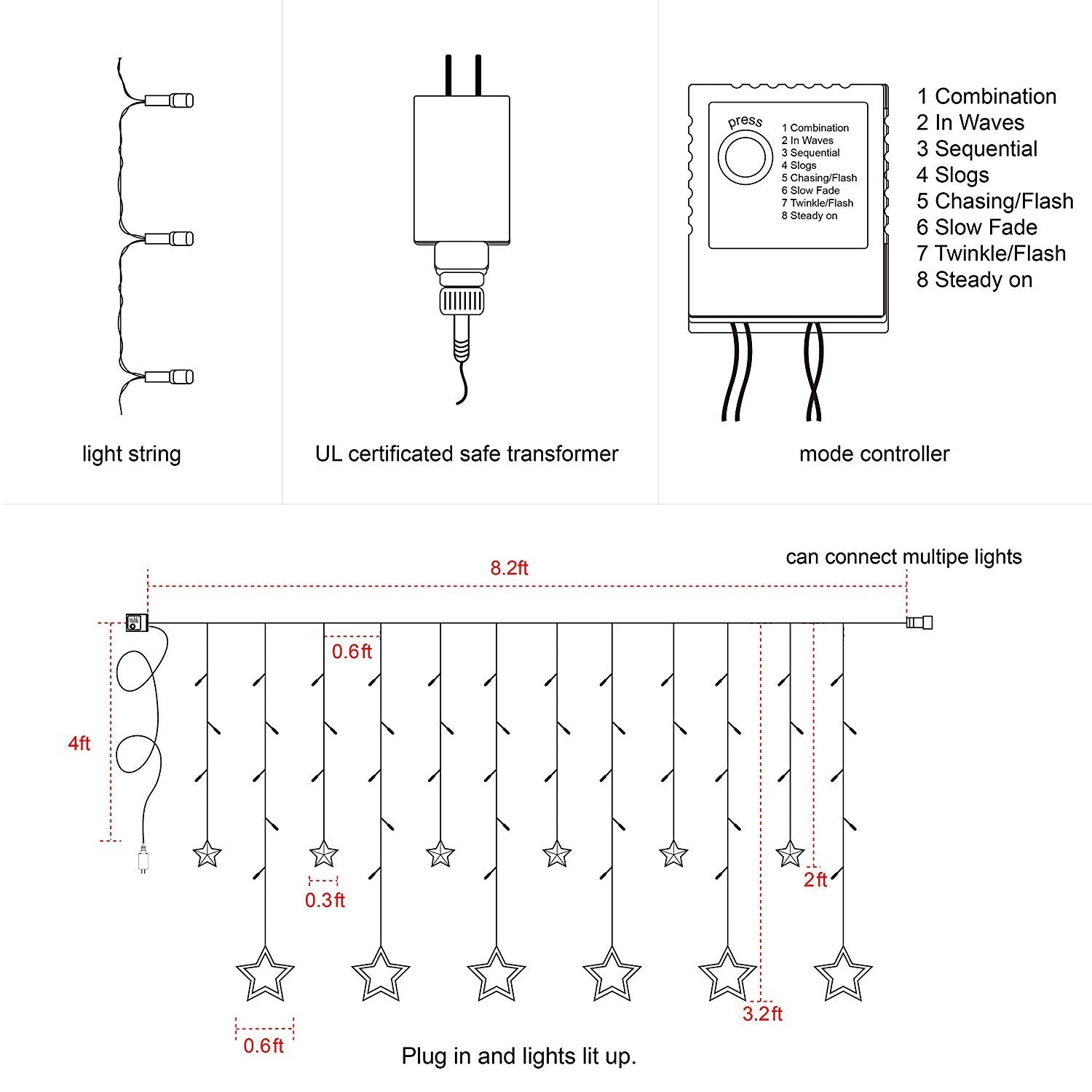 - 8 mode settings: combination, in waves, sequential, slo glo, chasing/flash, slow fade, twinkle/flash and steady on.
