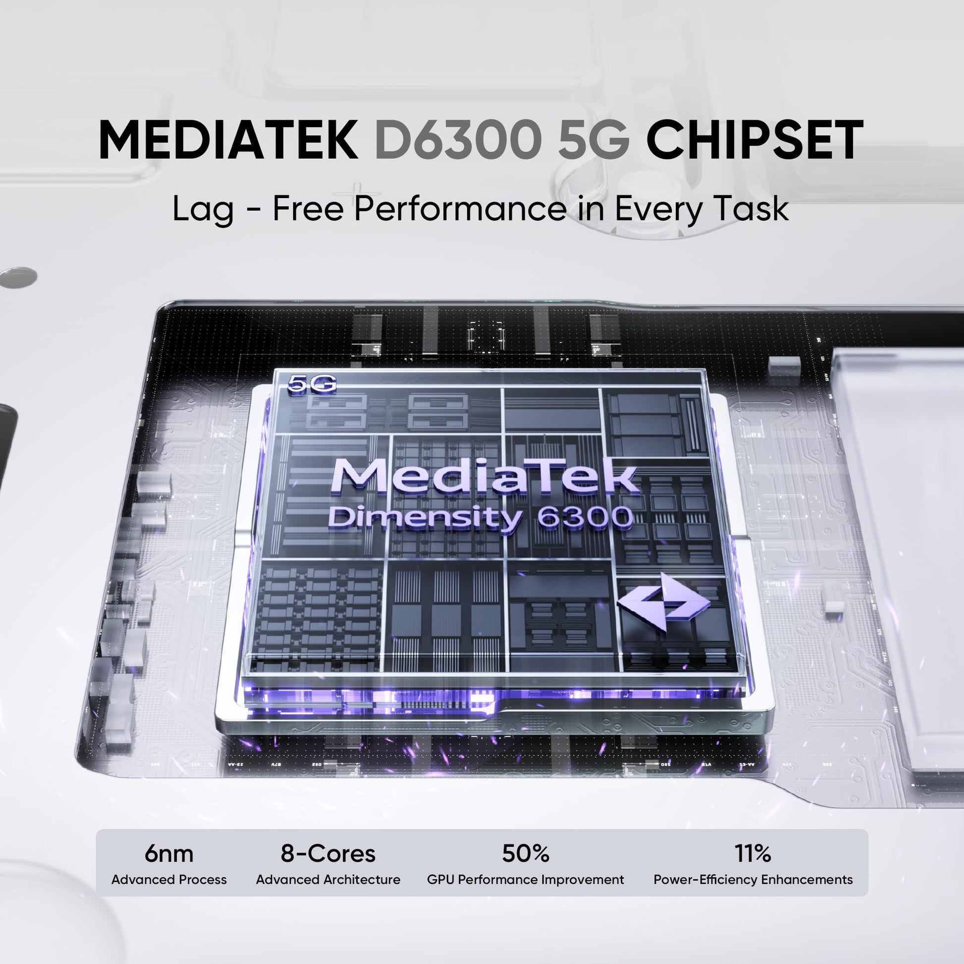 - MediaTek Dimensity 6300 5G: Enjoy fast and reliable 5G connectivity with a power-efficient processor.